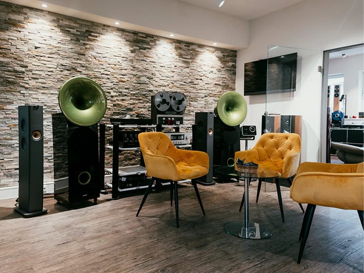 Oben angekommen öffnet sich der Raum – eine Mischung aus Wohnzimmer, Plattenladen und Showroom für Klang- und Bildsysteme. Blickfang ist eine Stereoanlage, deren einzelne Komponenten wie Schmuckstücke sorgfältig auf einem speziellen Hi-Fi-Rack arrangiert sind. Daneben zwei Hornlautsprecher mit grün glänzenden Trichtern. Das Grün wiederholt sich in der Plattenmatte des Schallplattenspielers und dem NAB-Adapter der Revox-Tonbandmaschine. Die gelben Sessel davor wirken wie farblich dazu komponiert.