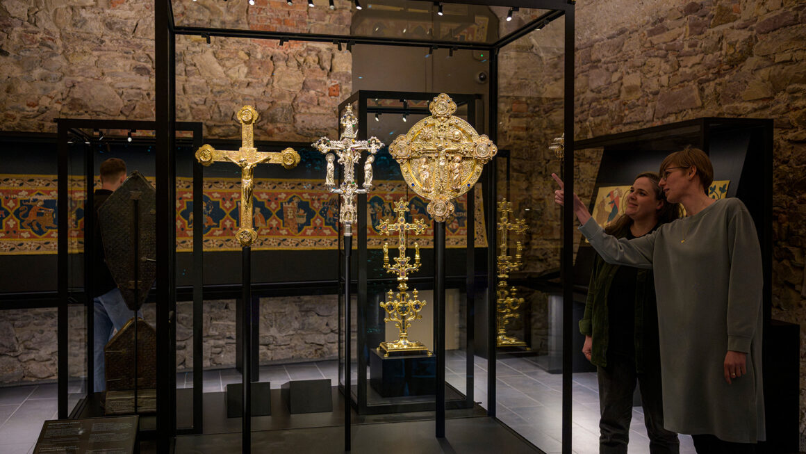 Habammer: Die Schatzkammer ist dafür ein gutes Beispiel. Der rund 300 Quadratmeter große Tiefkeller mit altem, feuchtem und salzbelastetem Mauerwerk diente vormals als Lager, später als Heizungskeller und ist jetzt Ausstellungsfläche mit kostbaren und empfindlichen Objekten wie dem Adelhauser Tragaltar aus dem 8. Jahrhundert. In so einen Raum gehst du nicht rein mit einer Lösung, die muss man sich erst erarbeiten. Der Schlüssel war letztendlich der bauphysikalische Ansatz, bei dem sich drei unterschiedliche Klimasysteme überlagern: Raumluft, Entfeuchtung und die separat klimatisierten Ausstellungsvitrinen. Um das stabile Klima in den Ausstellungsräumen zu gewährleisten, haben wir eine Raum-im-Raum-Lösung entwickelt. In der Schatzkammer ist die Klimatechnik nicht hinter einer Wand, weil das Mauerwerk sichtbar bleiben sollte, sondern im Boden, integriert in den Vitrinen und in einem separaten Bereich im Osthof untergebracht.